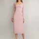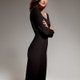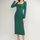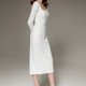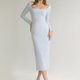 Simple wedding dress made of stretch crepe. Sheath silhouette, square neckline, tea length and long sleeves.