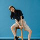 This pants have an higher waistband with two side tabs.fastened one inside the other, adjustable, so there's no need to use a belt to achieve the perfect fit.
