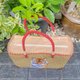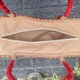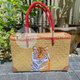 大型编织包,绣有老虎图案,搭配红色提把,并编织包边。