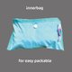 The inner bag has a storage pocket that can be rolled up or folded for packable storage in the pocket.