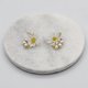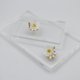此为不对称设计的饰品,将花朵以树脂包覆,并在花朵周围点缀三颗天然淡水珍珠。
