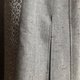 70% wool, polyester, nylon, acrylic mixed fabric. Light gray with brown thread accents. It has box pleats that are easy on the feet.