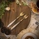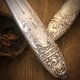 餐叉的柄是纯银,上面布满美丽的新艺术植物花卉浮雕,颈部有法国纯银Minerva印,以及哥德字体落款,叉面是黄铜,整体金银搭配,一共有12把,非常适合生日Party或聚餐时拿出来使用,这组我不敢说独一,但在台湾绝对是罕见。