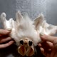 The head is made of polymer clay, painted with pastel. Glass eyes, a fur carcass, suede wings on a wire frame.