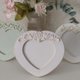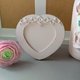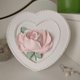 情人节礼物 手工制作的淡粉色心形相框,并配有粉红色玫瑰和白色装饰。