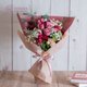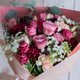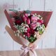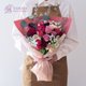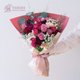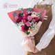 使用花材:蒙玛特紫玫瑰、酒红康乃馨、奶茶康乃馨、酒红洋桔梗、蕾丝花、圆叶尤加利、卡斯比亚。