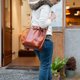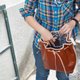 ● 深咖水桶包搭配植鞣原色背带,创造出撞色的年轻活泼设计包款,吸引许多目光注意。