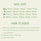 - 我们可以定制尺寸和甲型,请查阅图片展示上的尺寸及甲型图,留言告诉我们你的需求,请注意,由于甲片是手工定制的,需7-14天制作时间,下单后无法因为尺寸不适合进行退换货,谢谢!