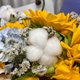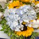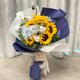 向日葵的颜色没法改变(改变的话某程度上就失去了向日葵光明的形象了),我们可以做的就只有从花束的氛围入手。考虑到这个意见,作品特意以向日葵及浅蓝色绣球作主花,配搭棉花及细碎衬花衬叶,既能保留向日葵明亮的寓意,柔和的浅蓝色绣球及棉花可将鲜明的感觉软化一点,衬上高贵的宝蓝色及白色花纸,就成了这束感觉高雅的向日葵花束。