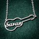 Custom name necklace in guitar shape .Can make you name in guitar pendant. Design and made by myself this pendant made from brass sheet by hand saw and fnish with silver plate.This necklace free box