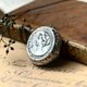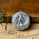 奢华与浪漫的圆形随身镜盒,盒面描绘了一位侧面轮廓优雅、发髻精致的女性头像,她被柔美的花环与流动的藤蔓所环绕。另一面则以三叶草式的线条,将自然花卉优雅呈现。
