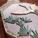 【材质及工艺】手工制作真丝扣条,盘制成松枝与仙鹤;装饰日本TOHO米珠、施华洛世奇水晶菱珠、法国进口绒线等等;搭配真丝湘妃竹团扇、手工制作的古法琉璃流苏。