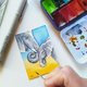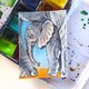 Mom and baby elephant painted with watercolor paints and black pen on watercolor paper.