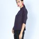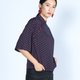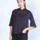 海军蓝和红色圆点宽松上衣,带喇叭形四分袖。 宽松款式易于穿着和移动的风格。