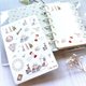 在类似和纸胶带的纸质素材上印刷插画,并进行半切处理。 请用于手帐装饰等用途。 具有透光性,容易与笔记本或纸张融合。 尺寸为 9×13.5cm 的一张贴纸 使用家用打印机印刷。