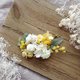 Fresh colored mimosa and pale yellow hydrangea create a natural and bright atmosphere.