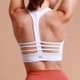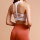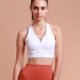 此款为V领胸下宽版的长版运动内衣,前胸若隐若现版型较为集中,背部缀以细条展现女性柔美。