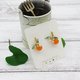 以 DIP ART 工法制作的橘子花1朵、花苞1朵、叶子2片,并搭配象征橘子果实的天然石“橘色玉髓”,精心制作而成。(※玉髓为对天然石进行染色处理。)