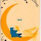 一只书呆子蓝熊倚在新月上,在一堆书上读书的设计。
