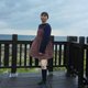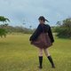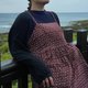 小白花红棕细条绒布,细肩绑带设计,可依照身型自行调整长度,下摆荷叶细褶样式,增加整体立体感。