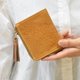 附有与钱包内部颜色相匹配的皮革制流苏造型吊饰。 完成了具有华丽气氛的小巧袖珍钱包。