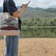 Square shape printed shoulder bag Inside there is a small bag with hooks for hanging. Made from polyester fibers mixed with cotton fibers. With features like this Therefore making the properties of the fabric have a medium hardness of the fabric, can support the weight well Can be washed and washed both by hands and machine.