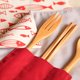棱形状餐具套,先由上角往下折(缺一角),再由左至右折一角,由左边往右边卷起,最后系起绑带即完成。