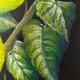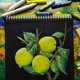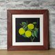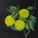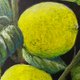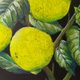 一幅小方形画,描绘了一棵结满果实的柠檬树。这幅画是用油画棒完成的。