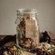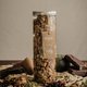 先将燕麦片与多种坚果拌匀,再加入琥珀色红茶茶汤,使燕麦片吸饱茶汤香气,并添加日本高级糖渍柚子片与细致茶末。