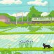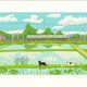 Two black cats and three tortoises are walking with 2 animals in the paddy field just after the rice planting. A train of two-car train will pass in the distance.