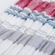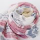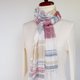 在制作宽幅的经纱时,等距离地织入蚕丝的强拈纱,形成了纵向的压痕,使其成为易于使用的细幅围巾。以五种颜色的亚麻纱线交织出多彩的条纹,压痕的效果营造出层次感,是一款清凉感十足的设计。