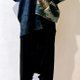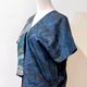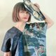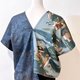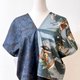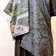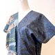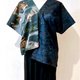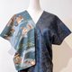 这件作品由两块触感、图案风格皆不同的布料共舞。一边是毛料印花,记录着千年传统的祈福祭典;另一边则是有着丝质光泽,黑色与蓝色交织出的华美风景的珍贵大岛䌷布料。这么不同tone调却又完美的融合,让人不禁心神向往跨越千年,人们借着华丽的祭典,祈求平安与幸福的心思依然不变。以灰、黑、蓝为主调,印衬着巡行队伍的图案,显得沈稳又庄重华丽。特殊的长短不规则设计可以将短版叠上长版处,再别上古董别针,不但可以从宽松的剪裁修饰成合身版,更能因着不同的别针展现不同风格。下着若搭配日式宽裤与厚底木屐,仿佛一秒身在日本老街。随性套上牛仔宽裤、夹角拖或布鞋,再搭上胶框眼镜,不羁的文青风格立现。