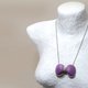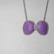 Unique bow design necklace, made from two natural seashells, colored in purple. They are crocheted and connected using fine linen thread. Adorned with one matching crystal bead. The bow pendant hangs from a gold tone chain that closes with a lobster clasp.