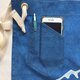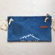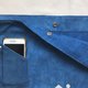 After dyeing 10oz canvas indigo, we use a paper pattern to create characters by removing the color called "discharge printing".