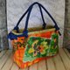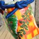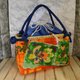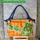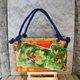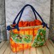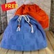*这是一款一贯扎篮包。它由橙的板染和纸和色彩鲜艳的抽象图案织带制成。提把是一条包着蓝布料的绳子,长度可以依照喜好调整。内袋附赠两种闪亮的蓝橙抽绳。您可以将其用作包巾,或搭配您的时尚风格。