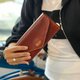 严选意大利进口牛皮制作,设计师特调染料手工刷染颜色制成。钱包采用信封式翻盖设计,配有衬色按扣,可稳妥开合,掀开即展现出井井有条的内部间隔,内置大型隔层、拉链零钱格和多个信用卡夹层。