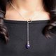 设计上采用水滴般的天然紫水晶,透过不同层次的光影之间闪烁灿烂,且充满随机的不规则感,为整件作品注入变化,也呼应自然垂坠的Y字链中流光溢彩,在微风中轻轻的摆动,没有过多的华丽元素,更增添了几分神秘感。