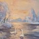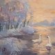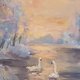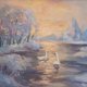 天空被涂上了粉红色和橙色的柔和色调,与雪的冷色调形成了温暖的对比。河水反射着落日的光芒,水面呈现出闪亮的金色。两只白天鹅优雅地在水面滑行,倒影略显模糊。河岸白雪皑皑,树木笼罩在寒霜之中,仿佛都冻结在冬日的寂静之中。在背景中你可以看到一栋露天的小房子。整个场景传达出冬夜的平静、温柔和安宁。