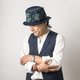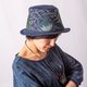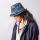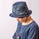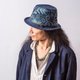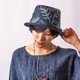 - 這頂帽子是用印度傳統布 "RalliQuilt" 製成的,用靛藍染色,並繡有烏茲別克斯坦傳統圖案 "石榴"。帽子上裝飾著"大島紬" ,一種來自日本鹿兒島的精細絲織品。這是為那些喜歡 "簡素" 和 "高質量" 風格的人準備的帽子,適用於成熟和