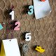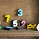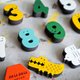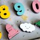 一组 10 个数字木图钉。 5 个图案木磁铁。