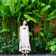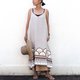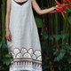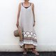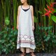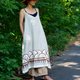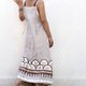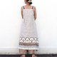 由木版印刷所印制的大片印花亚麻细肩带洋装。