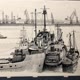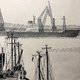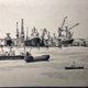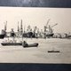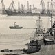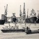 在前景中,较小的工作船被精确地勾勒出来,在平静的水面上航行。相比之下,背景突出了停靠在复杂的鹰架和机械旁边的巨型船只。重叠的元素创造了一种规模感,强调了船只与前景中较小船只相比的巨大。