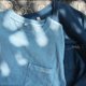 - 天然蓝染│胸前口袋三角形刺子绣Tee。纯棉,较为重磅,手感舒适柔软有质感,宽松版型十分适合夏天穿着,分浅蓝色和深蓝色两色可供选择,除了胸前三角刺子图案,还有右下角走线刺子,上下呼应,细节耐看。