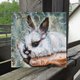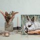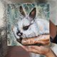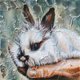 这只温顺的小兔子坐在你的手上。他可爱的毛茸茸的脸上装饰着天鹅绒柔软的耳朵和珠子眼睛。小兔子的主人对他来说就是宇宙的中心。这就是宠物向我们展示的惊人的信任。这幅画的主色调是复杂的灰色。对小兔来说,这个世界既神秘又有趣又可怕。这就是为什么灰色在这里带有绿色、蓝色或甚至更复杂色调的原因。野兔本身是白色的,耳朵是棕的,眼睛周围棕的。