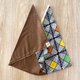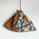 吾妻袋是日本传统袋物之一,由一片布料缝制而成,展开后呈斜角。袋口打结即可作为提把。此款式结合两种和服布料,并内衬加固。重叠处采用锁边缝法。