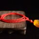 根据琥珀色泽编制两款不颜色的线绳,红色线绳搭配南红玛瑙圆珠,琥珀雕刻吉祥如意字样,收尾处制作珠扣。黄色线绳大人琥珀圆珠,琥珀雕刻平安字样,浅绿色手工绕线,制作珠扣收尾。
