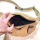 完全手工制作,拼接撞色的造型,布料采用水洗帆布,硬挺耐用,水洗色泽带有复古味道,可当腰包,也可做为斜侧背包包使用,线绳长度可调整,包体上的皮革采真皮革材质。