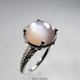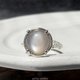 这款戒指将散发柔和光泽的灰月光石,镶嵌于饰有唐草与缕空图纹的座台上。