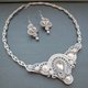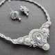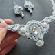 精致的新娘饰品套组,包含项链与耳环,采用南洋绳绣(Soutache embroidery)工艺制作。材质:珠饰、莱茵石水晶、细致珠粒、南洋绳。背面覆盖皮革。轻巧无负担。长度可调整(项链总圆周长为 48-50 厘米)。