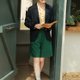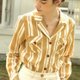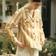 红色的扣子点睛而且让整体充满法式感,面料是非常特别的卡其黄竖条纹,带有一点亚麻棉的成分,手感很天然,胸口大口袋装饰更加随性。